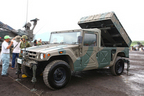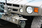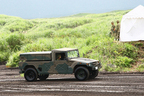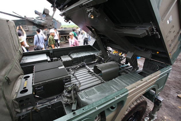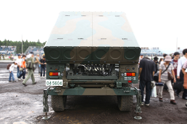 「96式多目的誘導弾システム」。対上陸戦闘において沿岸部に接近する敵舟艇を撃破、さらに、上陸してきた敵装甲車両などを攻撃することを目的とした装備です。同システムは情報処理装置、射撃指揮装置、地上誘導装置、発射機から構成され、「高機動車」の後部荷台にミサイル・ランチャーを搭載しています。写真は走行姿勢です。