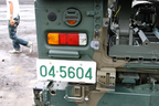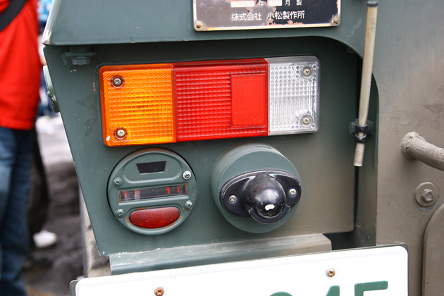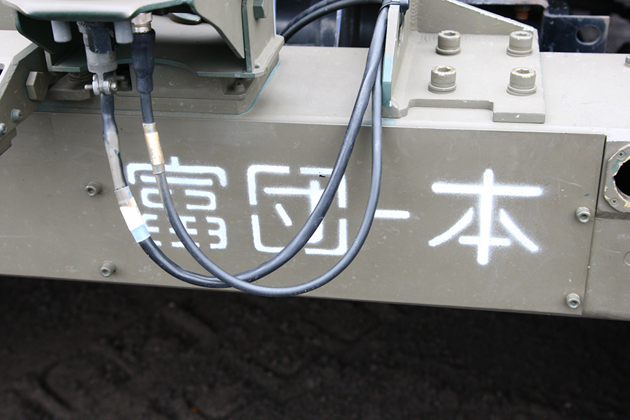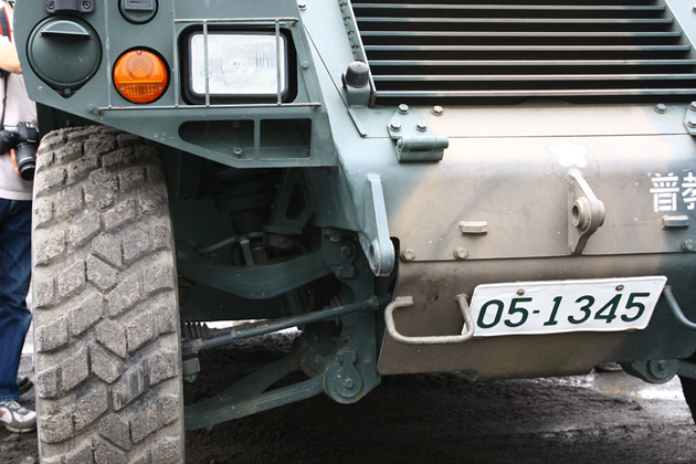 自衛隊法114条により道路運送車両法が適用されないため、公道を走る際に必要なナンバープレートも特殊なものとなります。上2桁は車両品名により異なり、写真の「04」は「他の番号の区分に属さない車輌および誘導武器たる自動車」という分類となります。