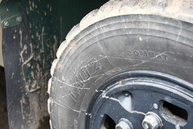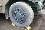 タイヤは「L302ロー・プロファイル275/70R22.5ランフラット」で、タイヤ空気圧調整装置が搭載されたコンバットタイヤです。