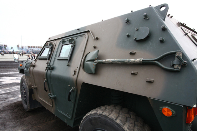 サイドビュー。窓には厚みのある防弾ガラスがはめ込まれています。