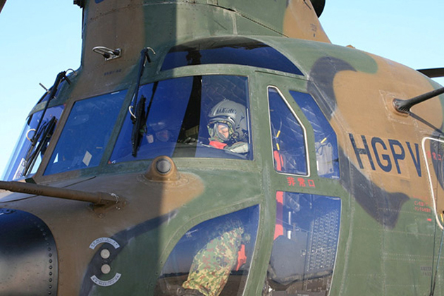 福島第1原発への散水。防護マスク・防護服を身につけ任務達成を願う。